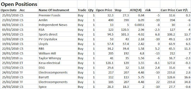 Spice has dropped considerably since October 2009. It has an all time low level of 24.198 set in September 2004. I suspect this level could act as potential support for this stock. A resistance level is a level at which a price drops to and immediatley bouces back up from. With the stock falling a further 6% on friday I decided to go long at £1 per point. I brought in at 28.3 with a stop set at 18.3. This is well below the potential support price of 24.198. As soon as any of my positions start to move into profit I start to move my stop up by 2ATR of price to break even then by 3or4ATR of price to give the position room to breath. I used to move all positions by 3ATR after break even but I have felt lately that for some positions this has been too close and I have been stopped out prematurely. Therefore on some postions I have decided to allow 4ATR as a stop distance. I will give this strategy more time to see if it works well. If I feel I am still being stopped out too soon I may look to trail my stops as a percentage of price say 10% or 15%. I know people who employ this strategy and it seems to have worked very well for them.