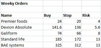 You will notice the risk on these is fairly low. Since I started with over £1000 of total funds I am allowing myself upto £10 risk on each trade. I know there are two which break this rule but not by much and I have allowed these potential trades as the others are well below my max £10 risk per trade. If you work it out accross all 5 orders my average risk is £8.72, I don’t expect all these orders will execute this week or even ever. In fact premier foods and galiform are orders that I had placed last week as well. The momentum divergence is still true for these stocks this week so I have placed the orders again albeit with adjusted buy prices to reflect buying the high of the previous week.